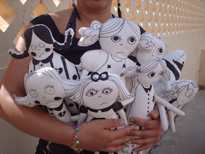 The production process of my dolls is very simple: first I paint their original forms, over the rustic fabric, similar to canvas tissue. Then the seamstress comes in the scene that cuts and sews them, put the arms and legs. Then, they came back to me again and I paint their backs and check about quality. There they are, ready!